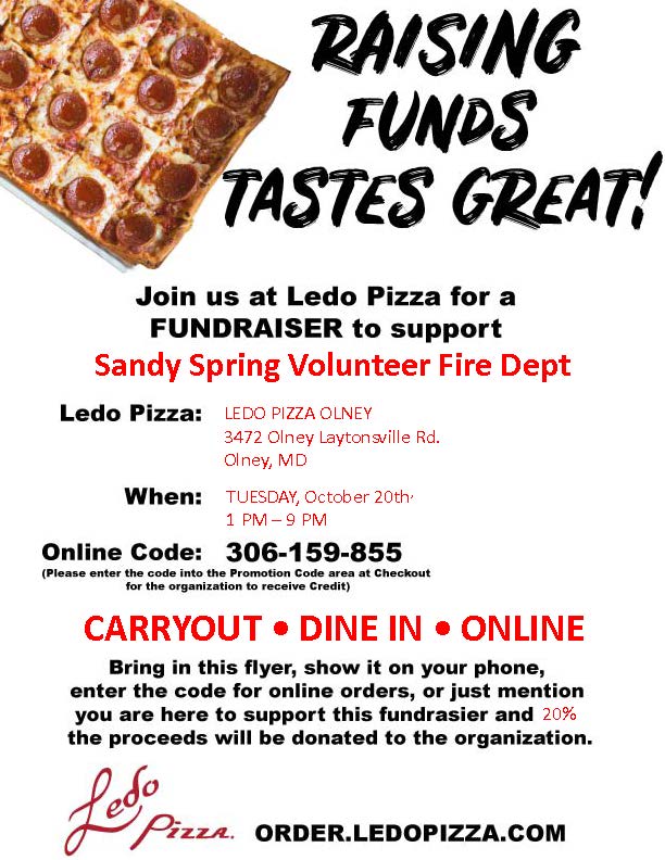 On Tuesday, October 20, 2020 from 1:00pm-9:00pm, the Sandy Spring Volunteer Fire Department (SSVFD) will be holding a Fundraiser at Ledo Pizza in Olney.