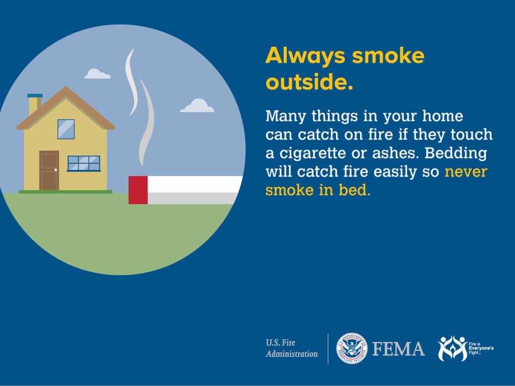Smoking materials, including cigarettes, pipes, and cigars, started an estimated 17,200 home structure fires reported to U.S. fire departments in 2014. These fires caused 570 deaths, 1,140 injuries and $426 million in direct property damage. Smoking materials caused 5% of reported home fires, 21% of home fire deaths, 10% of home fire injuries, and 6% of the direct property damage from home fires. Here is what you need to know about keeping your home and family safe!